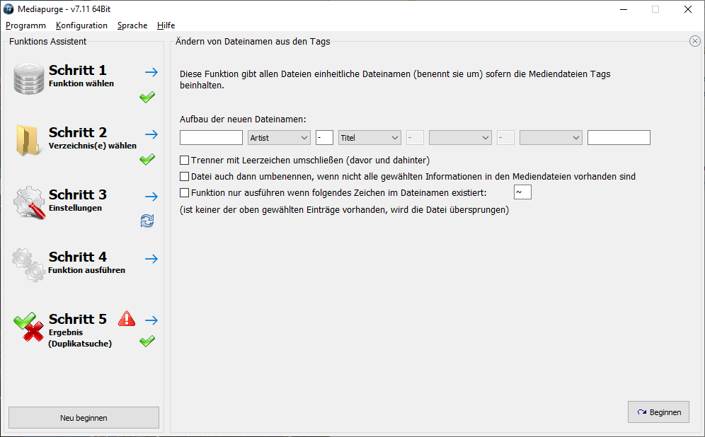 Aufbau von Verzeichnisstrukturen, wiederherstellen der Dateinamen aus den Tags,